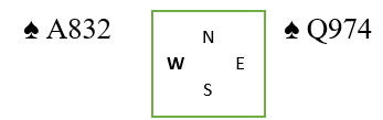 Hvis esset spilles først, blir det to tapere. Liten til damen, eller å dra damen (dekkes) gir også to tapere. For å unngå to tapere med denne sitsen må det ikke spilles esset først, men liten mot Q-9 og legge nieren idet nord legger lavt. Nieren krever tieren. Når du så kommer inn igjen spilles damen. Syd med gjenværende K-x kan intet gjøre. Dekker han stikkes med esset og knekten kommer på, og du kan ta ut deres siste trumf med åtteren. Legger syd liten fra K-x i fargens andre runde får damen seile og vinner stikket, og i neste stikk tas den siste trumfen ut – kun en taper.