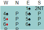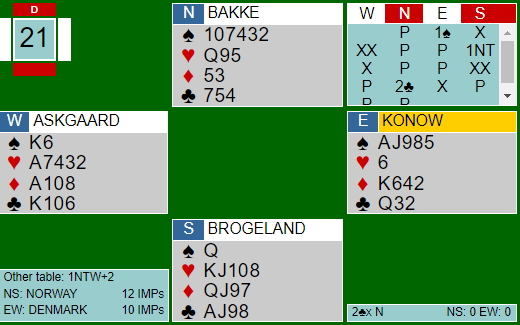 Mange vil åpne 1 kløver med vests hånd. Helge Egil gikk mer offensivt/destruktivt til verks med sin minorbaserte fordeling, og trår til med 3 kl. Nord dobler og syd melder utgangen i spar. Nå er Helge Egil med enda en gang. Syd står mellom dobling eller å satse på 11 stikk, og velger 5 spar. Nå blir også Odd Helge med på moroa, og avslutter med 6 kløver, som blir doblet. 10 stikk senere og 300 ut; et billig "offer" mot den potensielle utgangen NS.