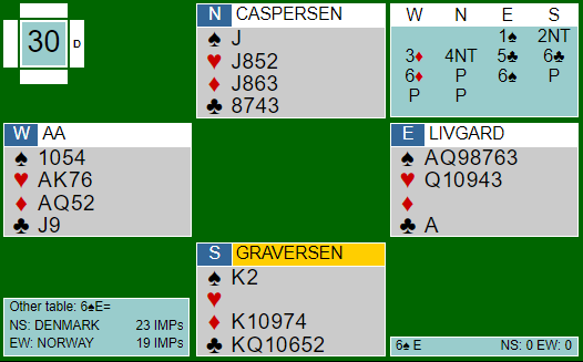Terje Aa hentet ni stikk i 1 grand. Med den aktuelle sparsitsen er det ikke noe problem å få tak i ni stikk, men det var ikke naturlig å melde utgang etter at øst innledet med pass. Kun tre bord meldte 3 grand, men ved åtte bord ble nord-syd doblet og måtte betale dyrt.