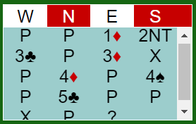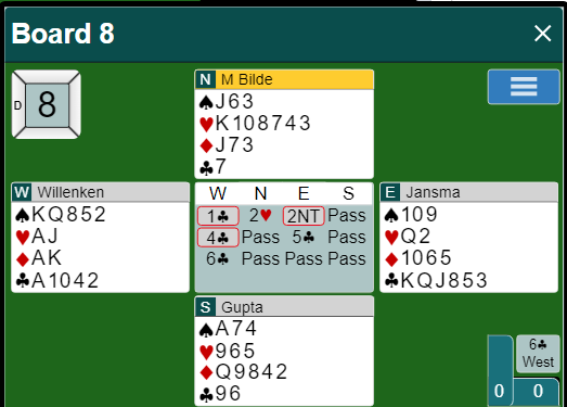 6 kløver bød ikke problemer siden kontrakten kom på vest sin hånd. Om øst er spillefører blir det ganske automatisk bet om syd spiller ut hjerter. Vest sin 1 kløver var sterk, kunstig melding. Morten Bilde sin 2 hjerter var et svakt innhopp. Og her hadde Ø/V en god avtale, 2NT viste kløverfarge. Vests løft til 6 kløver over 5 kløver var vel litt frisk, men blink.