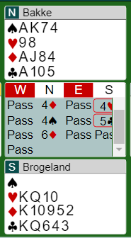 Som du ser valgte Bakke å åpne med 1 ruter fremfor 1 spar. Det er fordi han egentlig ikke har åpning, men åpnet likevel fordi det var en tredjehånds åpning og gunstig sone. Han tenkte nok på muligheten for at makkeren skulle bli utspiller, og ruter ut fra vest ser bedre ut med østs kort enn spar ut.
