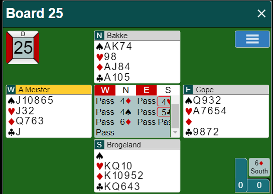 Syd var så sterk at han være med en gang til og doblet 3 ruter. Jeg forstår ikke Kranyak sin 4 ruter, men kjenner ikke avtalene deres.