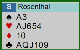 Rosenthal passet på 3 hjerter, ganske pessimistisk selv om det godt kan bli riktig. Det så litt ut som en misset utgang når trumfen satt snilt: