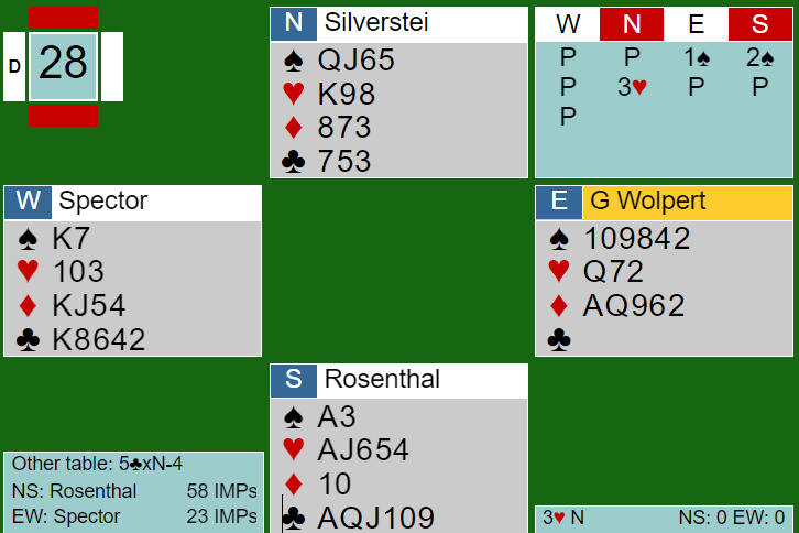 På en måte så det ut som Rosenthal hadde gjort det riktige da han sørget for at de stoppet i 3 hjerter. Men spillet er farlig, for motspillet må sitte for å bete 4 hjerter. Idet vest vant for spar konge i motspill mot 3 hjerter spilte han ruter til øst, så mer spar. Da kunne spillefører ha løst trumfen uten taper og tapt kun til kløver konge. Men han var bare i 3 hjerter og spilte hjerteren fra topp (esset først så liten til kongen) fordi han ville prøve kløverfinessen. Så det ble en hjertertaper og +140 for ni stikk. Det tror jeg N/S så på som ok. Men det er et sånt spill som enten kan bli et lite pluss-spill, eller et stort taptspill om N/S ved det andre bordet melder og vinner utgang.