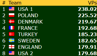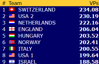 Norge har 147,38 VP etter 16 av 23 runder, og ligger foreløpig på 18.plass blant de 24 lagene. Avstanden opp til åttendeplassen er drøyt 32 vinnerpoeng, nøayktig det samme som den var etter gårdagens kamper. Vi får håpe poengsankinga blir stor i løpet av lørdagens fire kamper!
