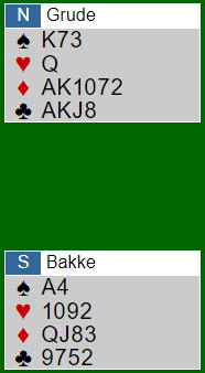 Bakke-Grude stoppet i 5 ruter. Da de viste seg at det måtte bli kløvertaper så det ut som om de hadde gjort det riktige, et mulig gevinstspill hvis motpartens N/S presset på for hardt? Dessuten kan det jo være mulig å havne i 3NT også, og den går bet med hjerterutspill.