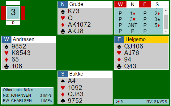 Etter åpningen 1 ruter ved det andre bordet kom N/S med på en annen mpte, og til slutt ble Grude spillefører i 5 ruter udoblet. Der ble det tre bet, CHARLSEN +150.