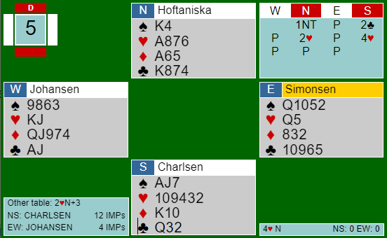 Hoftaniska-Charlsen noterte + 650, og da N/S ved det andre bordet stoppet i delkontrakt ble det 10 IMP.