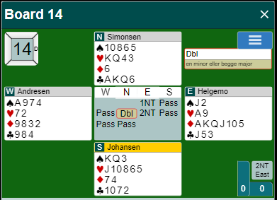 Etter Helgemo sin grandåpning som allerede sperrer mer enn 1 ruter gikk det pass-pass før nord doblet. Det viste enten en minor, eller begge major. Flertydige meldinger er populære forsvarsmeldinger, og det har mye for seg fordi man da får meldt med flere håndtyper. Men det er en svakhet, hvis motparten melder igjen vet ikke alltid makkeren til den som avga den flertydige meldingen om de har tilpasning. Og det har selvsagt Helgemo forstått, og derfor la han en liten sperremelding til: 2NT!