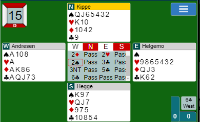 Det som mangler i det meldedigrammet er at vest åpnet med 1 kløver etter pass fra syd. Og det som kanskje også mangler er en melding fra nord, men Kippe valgte å passe i disse soneforholdene. Så det gikk 1 kløver (vest) - P - 1 hjerter - P, så 2 ruter revers fra vest og fortsatt pass fra nord. Resten ser du, og da Helgemo mente 5 kløver kunne være en bedre kontrakt enn 3NT og sa 5 kløver, la Andresen på til lilleslem da han definitivt hadde en god del ekstra. Logisk og greit!