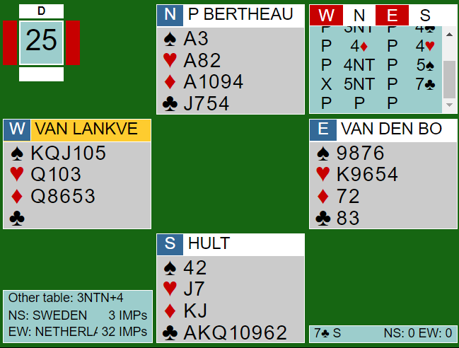 Begge spilleførerne tippet hjerteren med liten til esset og liten til tieren. Men så ble motspillet forskjellig ved det to bordene. Øst for Nederland fridde seg med kløver. En tredje trumfrunde ga litt gode nyheter for spillefører, men da Sveriges nord gikk på ruteren lå øst korrekt unna to ganger med ruter ess. Da ble syds hånd en øde ørken, to ruterstikk var alt svensken fikk i den fargen. Det endte med at han måtte gi bort to sparstikk i tillegg til ett i trumf og ruter ess, en bet, Nederland +100.