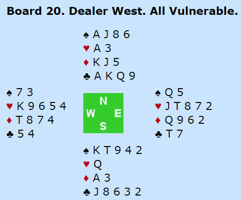 Nederlands N/S spilte 3NT. Da vest på alle kløverstikkene kastet to ruter og øst også kastet sine rutere fikk spillefører det lett og tok alle tretten stikkene da han fikk fire ruterstikk, Nederland +520. Men det er jo alltid minst elleve sikre stikk i grand.