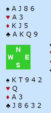 Det er en litt skummel kontrakt om det kommer hjerter ut fra øst. Hvis ikke sparfargen går, eventuelt tippes med topping eller finesse, blir det bet i grandkontrakt mens 6 spar/6 kløver er trygt. Trist i så fall, men bunn er bunn, og i parturnering kan en leve med det på en annen måte enn i lag, neste spill! Og går sparfargen er det jo tretten stikk både i grand-, spar- og kløverkontrakt.