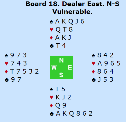 Det burde blitt +400, men da begge motspillerne for sikkerhets skyld kastet kløver ble det elleve stikk, BIN +460.