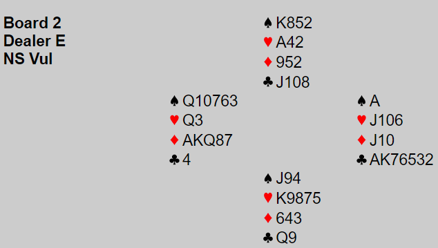 Motspillerne prøvde så godt de kunne, liten hjerter ut til esset, hjerter 4 tilbake som syd lå unna for å holde forbindelse i fargen i tilfelle nord kommer seg inn og kan spille sin siste hjerter. Det ville vært godt motspill hvis nord hadde hatt spar ess og spillefører kun åtte stikk fra topp, men i dette tilfellet var det ni stikk helt uten kløverfargen (1+1+5+2=9).