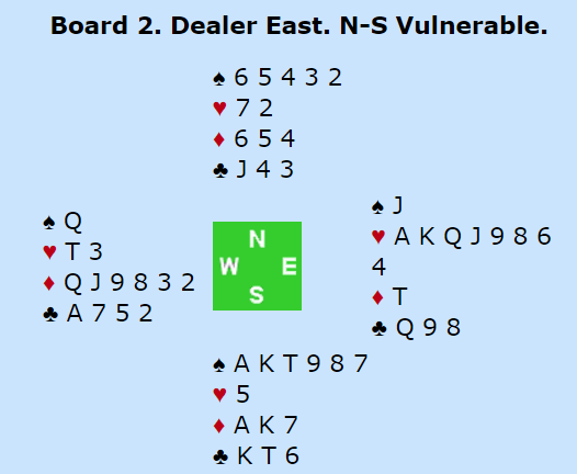 Ved begge bord ble kontrakten 5 hjerter doblet av øst etter at syd hadde vært i 4 spar. Spar konge kom i utspill fulgt av skift til trumf. Spillefører stakk på hånden og spilte ruter 10. Brogeland stakk med kongen og spilte spar som viste seg å være til dobbeltrenons. Spillefører stjal på bordet og kastet en kløver fra hånden. Det kan se ut som om det fortsatt skal kunne bli en kløvertaper, men det blir det ikke. Spillefører stjal ruter dame og kjørte i gang med hjerteren. Da den var oppbrukt hadde han kløver dame dobbel på hånden. Idet vest skulle ned på to kort på den siste trumfen lå det A-x i kløver og ruter knekt der borte. Foran bordet satt syd med ruter A og K-10 i kløver, og han måtte gå ned på to kort først. Syd ble skviset sønder og sammen, elleve stikk og +650 til Nederland.