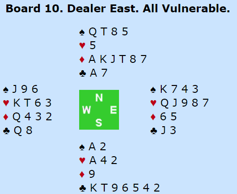 Ru J ut løp til damen og kl 7 tok det 2. stikket med fornøyd spillefører da Vest også fulgte. 4-1 imot mot fryktet 5-0 var positivt. 3. stikk var kl 8-9-10 og sak av høy ruter. Ru A, hj7 til 10-er og ru K som beholt stikket fulgte. Trumf fra spillefører stakk Øst som fortsatte med spar til konge og ess. Neste spar vant Bompis med damen og kulle ha tatt for kl K og så finesse i hjerter for resten, 12 stikk. Men det endte med hjerter til esset og bare 10 stikk. Det ga Frankrike +940 som ble belønnet med 9 imp. Ikke dårlig, men finesse i hjerter etter kl K ville gitt 12 stikk og grassate 1240 og +13 imp. Irland overkjørte Franskmennene og Norge tuktet svenskene men samme vinnersifre og man var dermed like langt i striden om mulig pallplass!