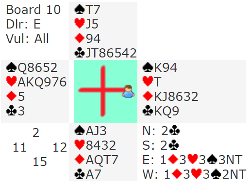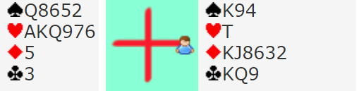 Vest meldte 4 hjerter, en praktisk melding. Det kan imidlertid være slik at 4 spar er kontrakten med vests kort, hvis for eksempel øst har singel eller renons i hjerter og firekorts spar. Men 4 hjerter ble det, og nord spilte ut spar 10.