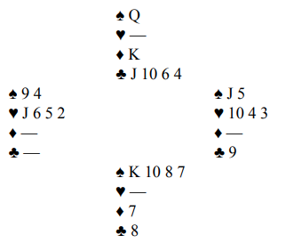 Han stakk sparutspillet, tok fire runder trumf selv om den fargen satt 3-2 (øst hadde tre) og gikk på hjerteren med liten til esset fulgt av kongen. I første hjerterrunde fulgte øst med åtteren, så med knekten. Nå spilte Gill hjerter 10, og da det kom liten fra vest kastet han en spar. Det var riktig siden hele spillet så slik ut: