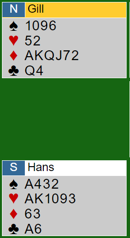 Nei, det er vel egentlig i hardeste laget? Sartaj Hans og Peter Gill mente dog det måtte være nære på i alle fall og endte i 6 ruter spilt av Gill (nord). Så var det "bare" å vinne den da...