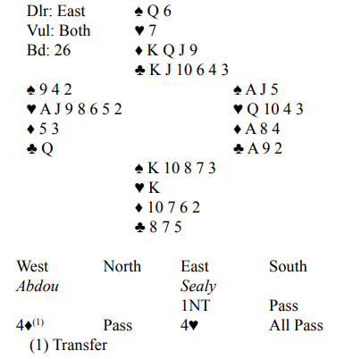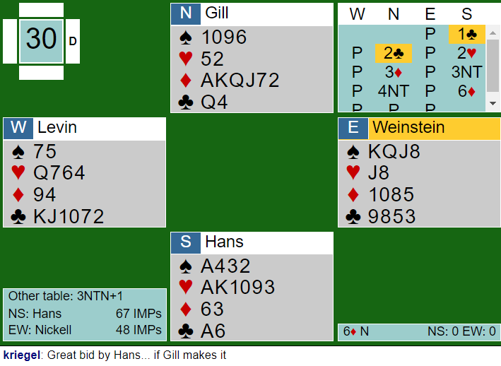 Hjerter 10 ga avkast for en spar, og den femte hjerteren kunne så godspilles og gi avkast for en spar til. Dermed var det tolv stikk, +920 til lag HANS. Det ga 10 IMP inn siden Nickells N/S-par spilte 3NT med ett overstikk.