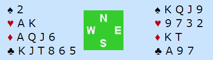 Det er feil å si at lilleslem avhenger av 2-2 i kløver i dette tilfellet. Den har større sjanse, for med så tette mellomkort vinnes tolv stikk både om kløver sitter 2-2 og om damen sitter singel. Dessuten vinnes om esset spilles først og syd har alle fire kløverne da det kan tas to finesser. Så de 40% for 2-2 er langt i fra alt, og det er vel en slem man ikke er så misfornøyd med å være i.