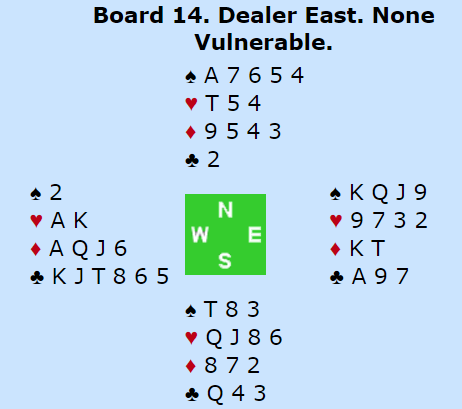 Norges Ø/V meldte 6 kløver. Kløveren ble spilt normalt, esset fulgt av liten til kongen, men da ble det en 20 IMP sving i kampen.