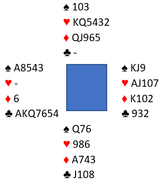 Berg tenkte slik: Jeg vet pga. meldingene at vest har minst fem spar og minst seks kløver. Og han er renons i hjerter, nord må jo ha sekskorts farge. Så enten har vest 5-0-2-6, eller 5-0-1-7 og nord har følgelig 2-6-4-1, eller 2-6-5-0 fordeling. Siden vest hadde litt lyst til å melde slem, uten ruter ess og uten trumf dame må han nesten ha singel ruter. Og da er makker renons i kløver!