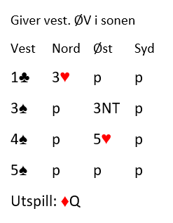 Du skal få en tilleggsopplysning. Idet øst sleminviterte med 5 hjerter tenkte vest litt før han slo av med 5 spar. Har det noen betydning?
