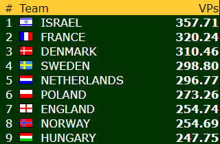 Etter stortap mot Danmark i dagens første kamp, slo det norske U21-laget kraftig tilbake i det BBO-overførte oppgjøret mot Frankrike i dagens andre kamp. Der spilte de norske guttene godt og vant til slutt kampen med IMP-sifrene 36-4. Dermed fikk de med seg nesten 18 VP fra kampen. Før siste runde er stillinga slik:
