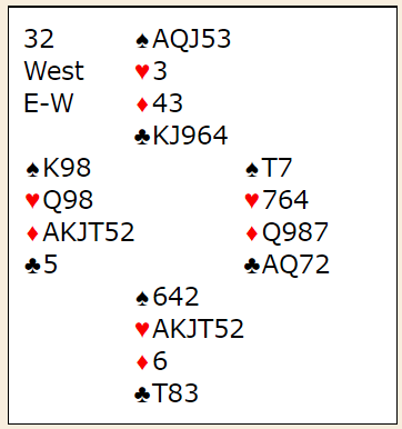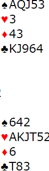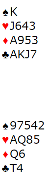 N/S vinner enkelt 5 hjerter, men ikke 6 hjerter om vest spiller ut spar. Vel, det står faktisk i 6 hjerter, men da må nord være spillefører! I så fall er spar konge beskyttet. Om øst mot hjerterkontrakt spilt av nord ikke tar for spar ess blir det tretten stikk. Nord sine to spar kan kastes på kløveren. Følgelig er maksimalscore i teorien +1430 til N/S (6S spilt av nord). Så "par", dvs. det som er maks på spillet om alle gjør det riktige som ikke er så lett med slikt uten å vite kortene, er +500 til N/S, for Ø/V kan stampe helt opp til 6 spar hvor det kun er tre doblede bet. Teori og praksis er imidlertid to forskjellige ting...