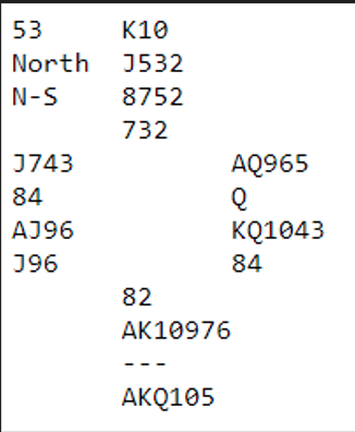 Solli sitt åpningsbud viste 20-21 jevn hånd og med to gode 5- korts farger hadde jeg god tro på slem. Overføring til spar og så 4 ruter som var ment som ekte farge utløste kontrollmeldinger og jeg valgte å satse på lilleslem i grand. Syd spilte ut hjerter og Nord sin knekt kunne Terje vine med damen. Hvordan vinne?
