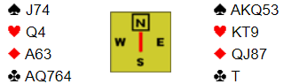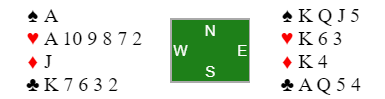 For vårt motstanderlag måtte trumfen løses i 6 hjerter etter at nord spilte ut ruter ess. Spillefører (vest) la ned hjerter ess og syd fulgte med knekten. Dette er en såkalt restricted choice situasjon, og i følge den teorien er beste sjanse å ta finessen nå. Spillefører gjorde det, etter hjerter ess, knekt fra syd, fikk tieren seile. Men det var uheldig og han gikk en bet da hele spillet så slik ut: