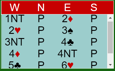 Vanlig grandåpning (14-16 eller 15-17), overføring til hjerter, og 3 spar var generell sleminvitt med hjerter som trumf. Øst har altså minst sekskorts hjerter. Vests 3NT viste en ikke så god hånd for slem, og 4 kløver viste kløverkontroll.