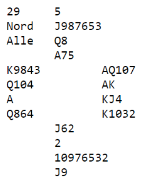 Det ble nevnt i det innlegget om Steinkjer Open at ett Ø/V par rotet seg opp i 7 spar som unektelig er hårreisende meldt. Den håpløse storeslemmen ble spilt av vest. En av de flittigste medlemmene av "Klagenemda" innrømmet at det var han som hadde spilt 7 spar. Paret det dreier seg om gjorde det skarpt i lagturneringen, ikke så bra i par hvor dette spillet er fra. Det blir kanskje for ufint å nevne med navn hvem det var som spilte 7 spar? Og hvem som hadde skylden i meldingsforløpet vites ikke. Men jeg kan si så mye at det IKKE var Håkon Otieno Kippe som var spillefører i 7 spar, for han sitter øst når han spiller med Kristoffer Hegge Berg...