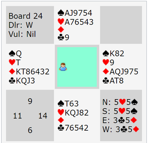 Her kan N/S vinne 5 hjerter eller 5 spar, Ø/V kan vinne 5 ruter. Det skal imidlertid svært lite endring av sitsen til før Ø/V vinner slem.