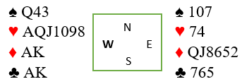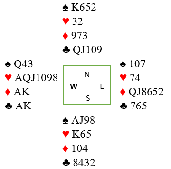 Vest hadde fått utlevert en flott vifte i dette spillet. Etter sterk, kunstig 2 kløveråpning melder vest hjerteren, antagelig to ganger, og havner i 4 hjerter til slutt. Nord spiller ut kløver dame.