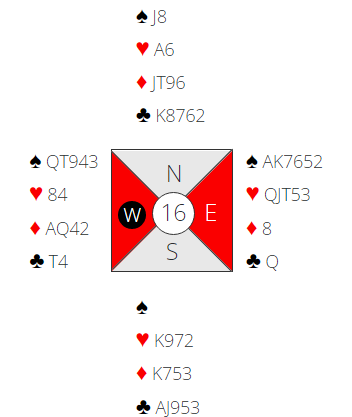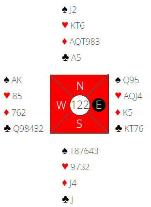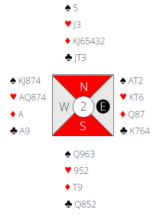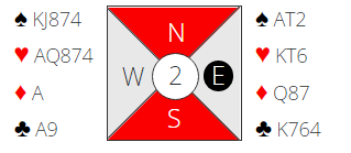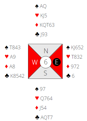 Det er ikke unaturlig å havne i 6 spar eller 6 hjerter her. Det er en god slem, og siden jeg kan fortelle at hjerterfargen sitter greit handler det om tolv eller tretten stikk. Og det er valget i spar som her avgjør mange parturneringspoeng.