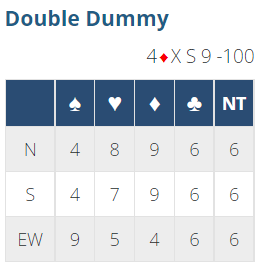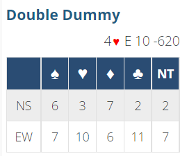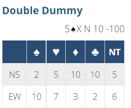 Det som står rett under "Double Dummy" er såkalt "par" på spillet som er det som er maks om begge par gjør alt "riktig" både i meldingene og spillet. Altså, riktig slik det sitter. "Par" her er 5 kløver doblet spilt av N/S med ti stikk.