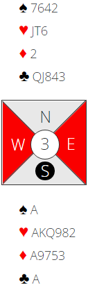Da fås kun to ruterstjelinger hos nord, og kontrakten er litt i fare. Men som du ser, det går an å spille god ett kløverstikk ved å legge ned esset i den fargen, stjele en ruter og dra kløver dame. Kongen blir fisket opp mot trumf og gir avkast for en ruter. Så det kan vinnes tolv stikk selv med trumf i utspill.