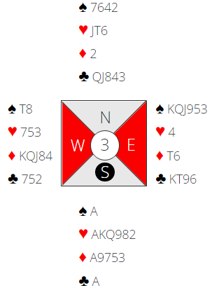 I dette spillet avhenger mye av hvordan meldingene går. Hvis Ø/V bruker svake grander (12-14) kan det bli trist denne gangen, for da vil nord få muligheten til å melde inn med ruterfargen sin. Også hvis vest etter sterk 1NT fra øst "roter litt rundt", dvs. for eksempel overfører til kløver først, vil nord kunne melde. Om det derimot går rett frem, 1NT fra øst og svaret 3NT fra vest som vel er en grei melding, er nord utmeldt. Og da skal syd finne ut utspill mot 3NT. Etter spillet oppdages at ruter ut er tingen, men det er det ikke mange som finner på.