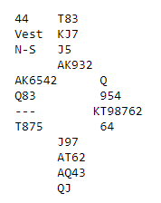 En ting er at å melde kan føre til at du bli slaktet fullstendig, en annen er at makker kanskje tror du har bedre kort. Hvis du melder inn 3 kløver tror han du ofte har seks kort i fargen. Dobler du og øst er sterk er du skikkelig i gjørma. Det er viktig å ikke bli for passiv, men i slike soneforhold kan det lønne å ikke være for tøff i trynet av og til. Jeg passet. Øst sa 3 ruter, og vest meldte 3 spar med pass rundt. Slik så hele spillet ut: