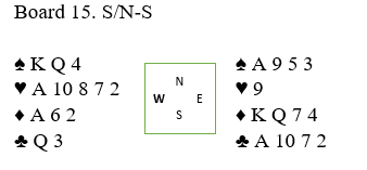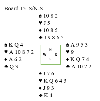 Vi skulle altså spille mot 3 spar, og jeg spilte ut kløver ess. Da blindemann (øst) kom ned begynte vi å le, for vi hadde spilt spillet før - i forrige runde! Da satt vi imidlertid Ø/V og var heldige, N/S gikk bet mot oss i stedet for at vi som Ø/V eventuelt ville gått bet som mange gjorde, noen i spar- og noen i ruterkontrakt. Mange av dem var doblet, og N/S fikk hele +800 ved fem bord. Hvis vi hadde spilt spillet sånn som det gikk andre gangen vi førsøkte oss på det ville vi fått litt over middels for et par udoblede bet i 3 spar.