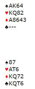 Hva ville du ønsket å være i med disse kortene? Det klare svaret ditt er vel 7 ruter? Den kontrakten er god om ikke ruteren sitter 4-0, og helt nedlegg om trumfen sitter 2-2. At en farge hvor makkerparet har ni kort til sammen sitter 4-0 skjer statistisk i litt mindre enn 10% av tilfellene (I tillegg er det en svært marginal sjanse for at det kommer en farge ut til stjeling hos han andre, men det utgjør nesten ingen ting).