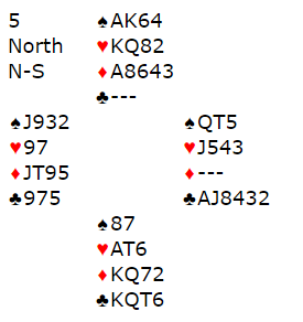 Spillefører måtte kaste kort fra øst idet han spilte god hjerteren, og etter hvert fikk han kastet alle østs kløver samt en spar han ikke trodde han hadde bruk for, og det ble etter det godspilte stikket for den femte hjerteren kun to ruter igjen hos øst, og det var den lekre finessekombinasjonen Q-7! Og det er vel bedre å spille på den finessen enn at sparfargen sitter 3-3? Spillefører tok sidestikkene siden inkludert kløver ess. Med to kort igjen spilte han liten ruter fra vest og ba med stø røst om syveren fra øst, men da ramlet taket i hodet på han. Slik så hele spillet ut fra start: