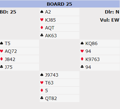 Det er ikke helt nedlegg i 3NT med nord som spillefører, men den vinnes normalt. Og det er den kontrakten de aller fleste vil havne i, og det etter kun et par melderunder: 2NT åpning fra nord, overføring til 3 spar og 3NT forslag neste gang – nord passer.