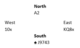 Hvis du etter esset og en til legger nieren over åtteren vinner vest med sin honnør, men du taper senere to sparstikk til østs honnør-10 dobbel siden du må spille spar fra syd. Hvis det sitter 3-3 spiller det som sagt ingen rolle hva du legger i fargens andre runde.