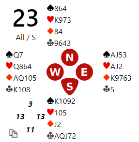 Ved to bord ble det i dette spillet spilt delkontrakt. Ett par i tillegg til de som gikk bet i 5 ruter havnet i minorutgangen, men de vant den. Alle de andre spilte 3NT. Kun en spillefører gikk bet i 3NT.