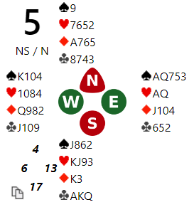 Med SCORWAY N/S ble kontrakten 3NT. Det var ingen dårlig kontrakt, men 4 spar er mye bedre siden det er kun en hjerterstopper (og en ruterstopper). Med stor hjerter ut fra øst var det kun åtte sikre stikk i grand selv om kløveren gir fire stikk. Sparfargen måtte løses for å vinne utgangen.