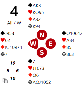 I meldingene er det dog ikke alltid så enkelt å diagnostisere alt, noen ganger forstyrret av motmeldinger også. I dette tilfellet stoppet SCORWAYs N/S i 4 hjerter og vant tolv stikk, +680. Det er et sånt resultat som kan slå begge veier. Spillet tapes stort om de er i 6 kløver ved det andre bordet, eller om Ø/V ikke finner kløverstjelingen. På den annen side vinnes spillet stort om de er i slem og går bet ved det andre bordet.
